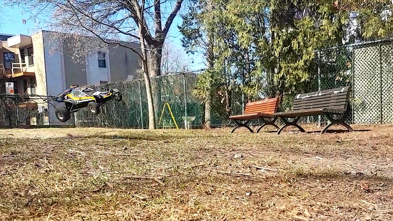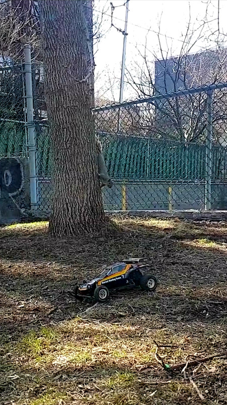 The crappy park around the corner, usually unsuitable for RC, has proved to be a great spot for running in this window between snowmelt and the grass growing back. Dust, dirt and even some sand are present at that spot, along with the usual bunch of furry spectators. A squirrel actually chased after the Hornet yesterday and then I chased it back, it got so hilarious I had to stop driving for a moment