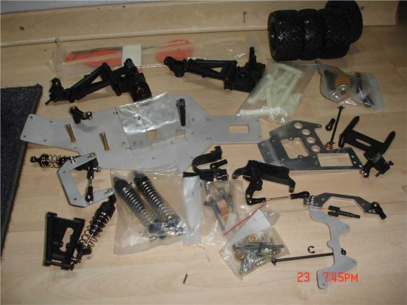 Third one is an Alpha EP rally car. These came in brown, blue, and black, brown being the first generation. Slightly similar chassis for both EP and GP was available. Not too bad a chassis, as long as you added full bearings and replaced the shocks (which were friction, and the top of the shock had no actual physical connection with the bottom!). With shocks and bearings, these made a fine rally basher.